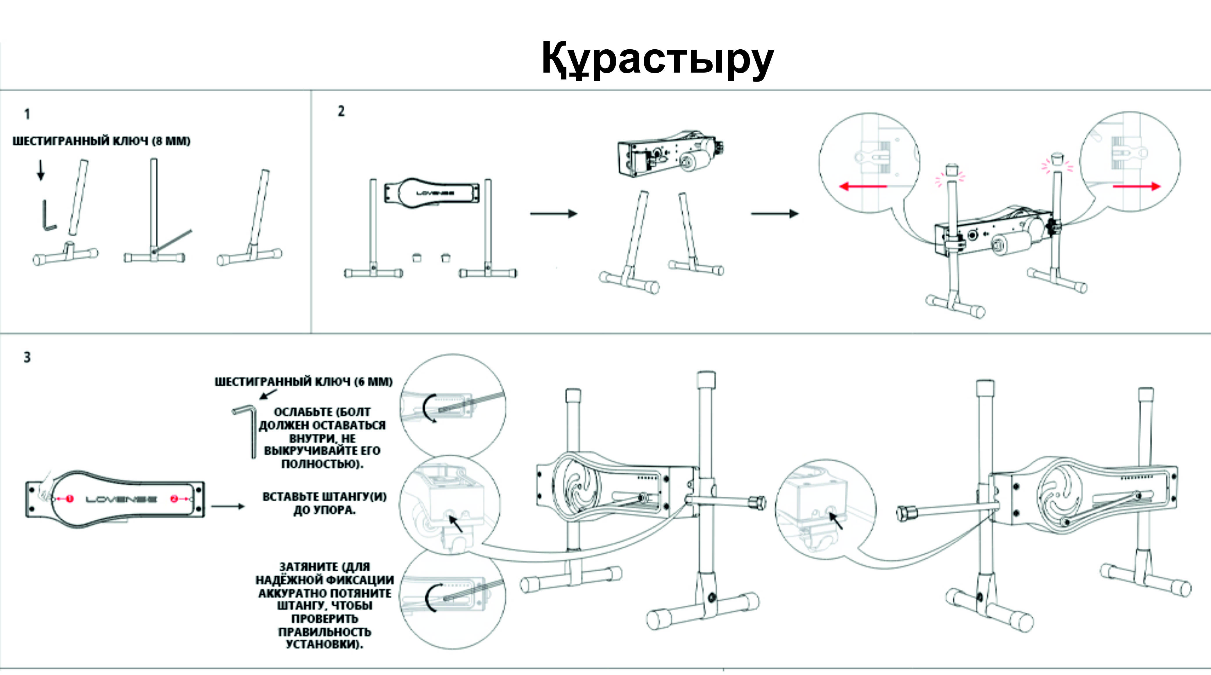 Құрастыру және қосу аяқталғаннан кейін барлық элементтердің сенімді бекітілгенін, бекіту болттарының тартылғанын және құрылғының тұрақты бетке орнатылғанын тексеріңіз.