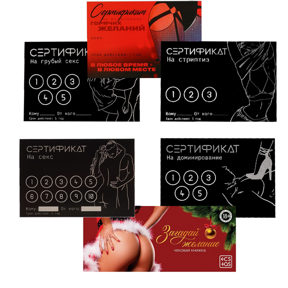 Таңдау жинағында түрлі көңіл күйге арналған нұсқалар бар: «Горячие желания», «Оки-Чпоки: Секс», «Подчинение», «Доминирование», «Грубый секс», «Стриптиз» «Новый год: Загадай желание» — екеуіңізге жақын тонды таңдаңыздар.