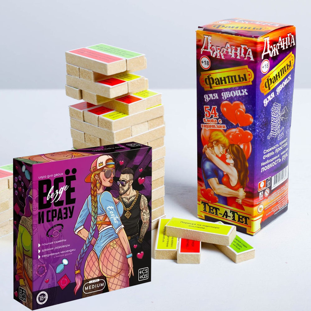 Таңдау ішінде екі түрлі механика бар: Тапсырмалары бар мұнара (54 ағаш брусок) — динамика, сәттілік және әр жүрістегі «сюрприз әсері». «Барлығы, барлық жерде және бірден» жиынтығы (60 карта + атрибуттар) — дайын сценарийлер: сұрақтар, сүйісу, «оған/оған арналған» тапсырмалар мен позалар карталары, екі өту режимі және 10 күндік челлендж.