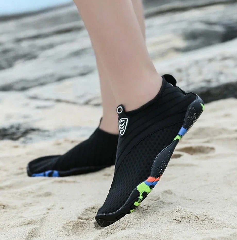 Износостойкая подошва из термопластичной резины надёжно предохраняет ноги от горячего песка, острых камней, кораллов и морских ежей, а противоскользящая структура помогает уверенно двигаться по мокрым поверхностям. Усиленный носок дополнительно защищает пальцы от ударов и механических повреждений.