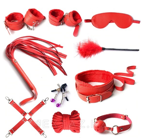 Жинаққа кіреді плётка, верёвка для бандажа, маска, кляп, ошейник с поводком, оковы для рук и ног, зажимы на соски,