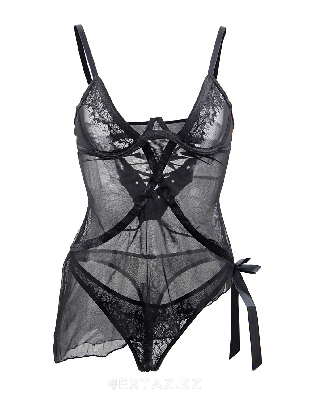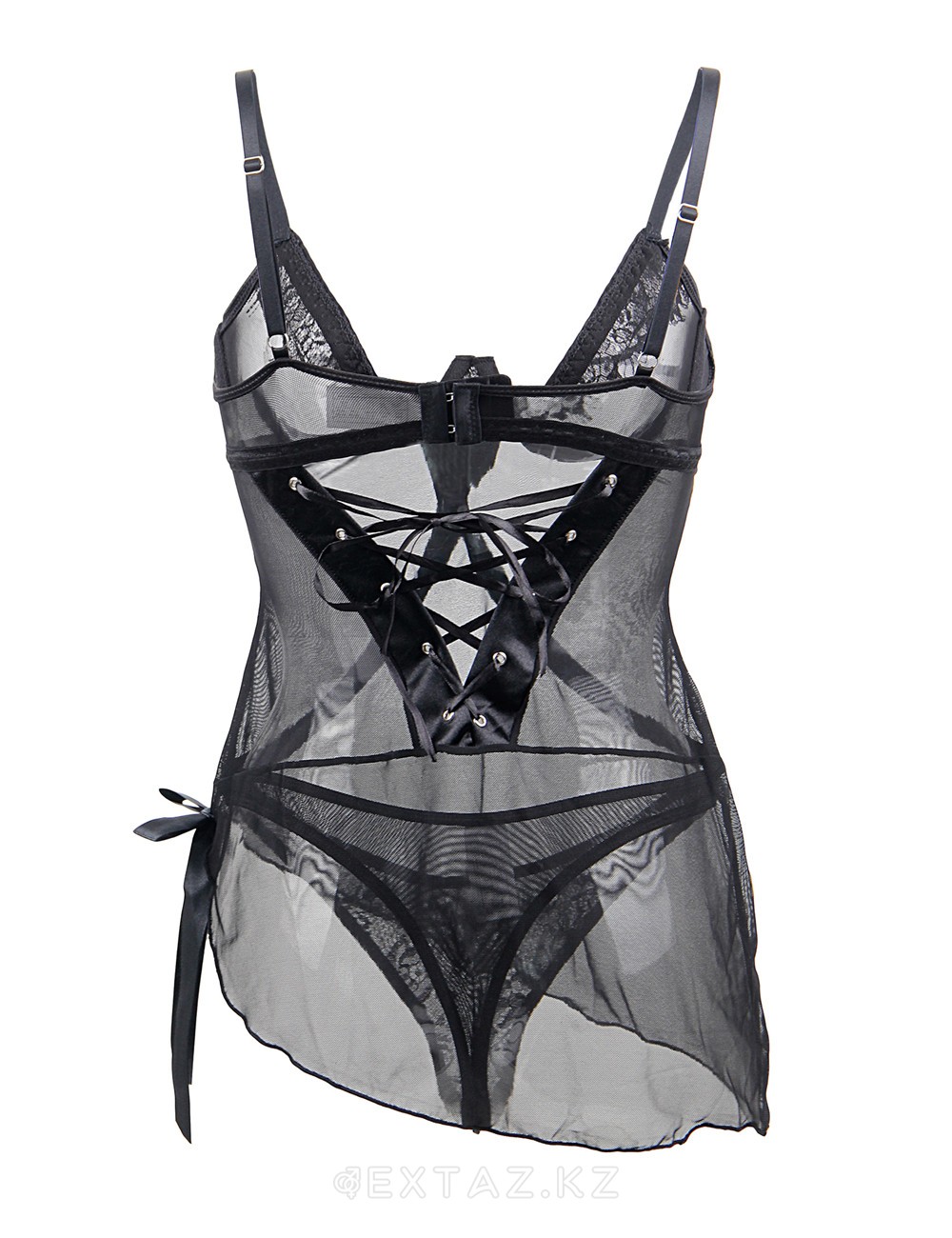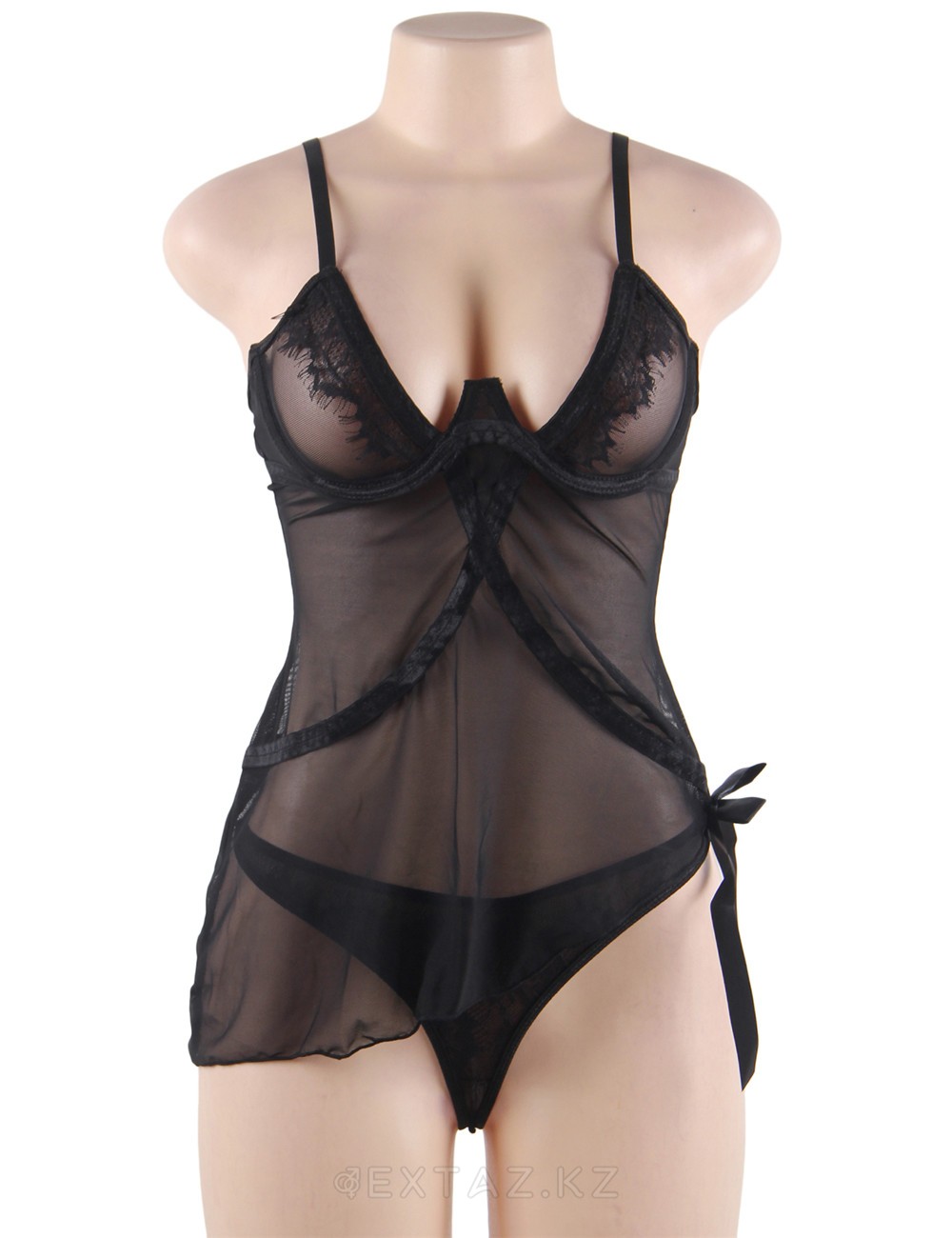 Полупрозрачный бэбидолл в комплекте с ажурными трусиками-бикини добавляет своей обладательнице нежную, ненавязчивую сексуальность. Сзади декорирован шнуровкой, такой элемент декора отлично дополняет общую картину. Обратите внимание на интересное устройство бюстье- снизу имеется треугольный выступ, который разделяет грудь, а косточки ее надежно поддерживают.