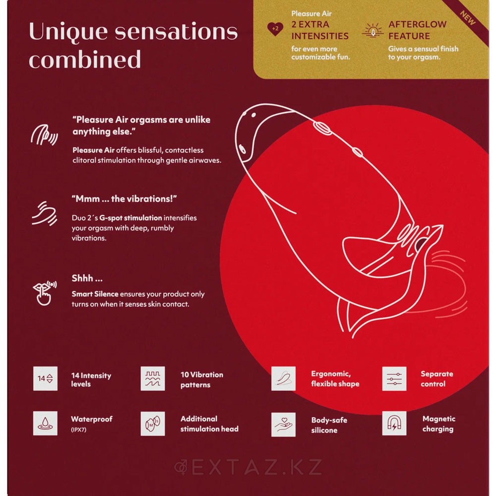 Оның сипаттамаларының ең қызықтысы-сіз клиторальды және қынаптық еркелетуді бір уақытта да, жеке-жеке де тамашалай аласыз. Денеңіздің ең сезімтал аймағындағы ауа ағындарын G нүктесінің ақылға қонымды массажымен біріктіріңіз және су өткізбейтін корпустың арқасында ваннада немесе душта да ең жарқын оргазмдарда қайта-қайта жарылыңыз. Afterglow функциясы шарықтау шегін ыңғайлы аяқтау үшін төменгі параметрлерге оралуға арналған.