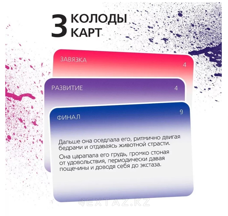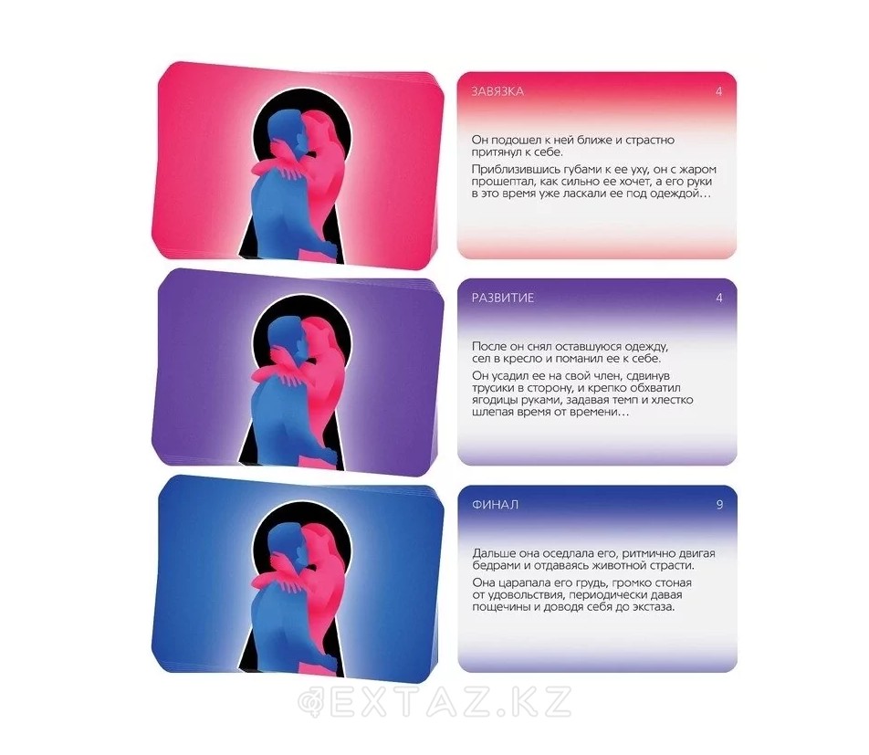Карталарды үш палубаға бөліңіз: "галстук", "даму" және "Финал". Әр палубадан бір картаны тартып, оларды ретімен қосыңыз. Сіз өзіңіздің жыныстық қатынасыңыздың сценарийін аласыз және ол әр уақытта жаңа болады.