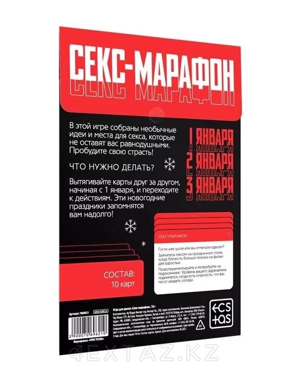 Кімде қандай, ал бізде жыныстық марафон бар! Ол жыныстық қатынас пен жағдайларға арналған ерекше орынға байланысты әртүрлі тапсырмалардан тұрады. Жартыңызға қызықты приключение ұсыныңыз немесе серіктесіңізді "әлсіз" етіп алыңыз және бірінші қаңтардан бастап барлық тапсырмаларды орындаңыз. Бұл кем дегенде қызықты болады және жыл мүмкіндігінше дұрыс басталады! Жиынтықта әртүрлі тапсырмалары бар 10 карта бар. Бір-бірлеп созыңыз және өзіңізге ұмытылмас демалыс беріңіз!