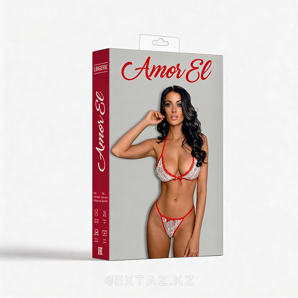 Amor El ұсынған capagosa эротикалық іш киім жинағы-нәзік шілтер мен мәнерлі контрасттардың жарқын үйлесімі. Қарлы-ақ көкірекше қызыл белдіктермен безендірілген, олар иық сызығын керемет түрде ерекшелендіреді, ал жұмсақ қызыл серпімді жолақтағы ашық жіптер көріністі толықтырады және силуэтті ерекшелейді.