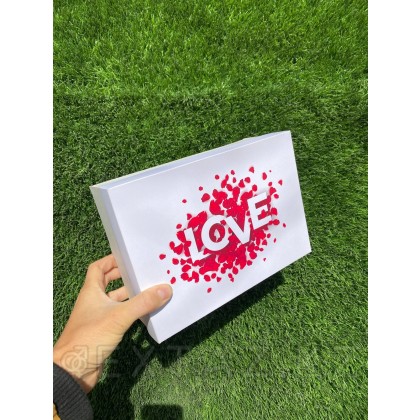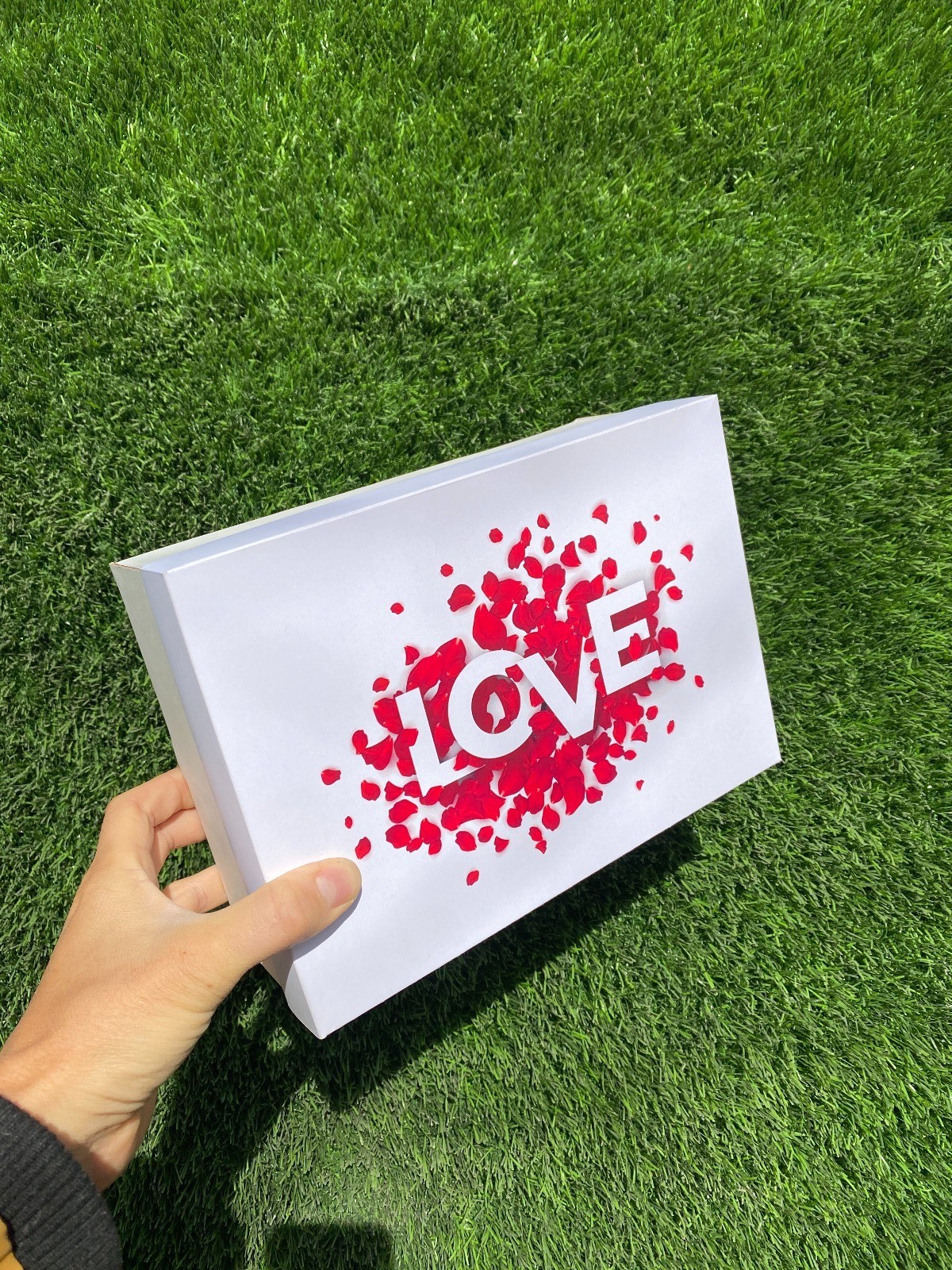 Қорап ақ түсте, жүректі құрайтын қызыл жапырақшалардан тұратын love жазуы ретінде жарқын басып шығарылған. Контрастты дизайн бірден назар аударады және ораманы эмоциясы бар сыйлықтар үшін тамаша етеді — махаббат, қамқорлық және назар. Ақ түбі дәлдік пен премиум көріністі көрсетеді.