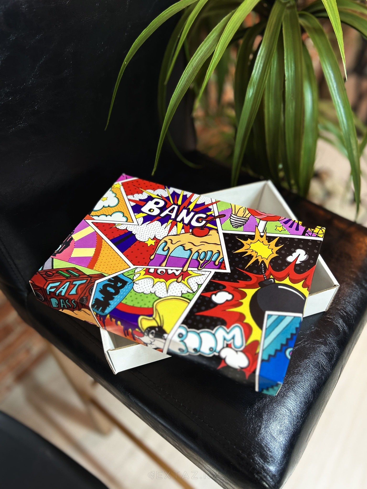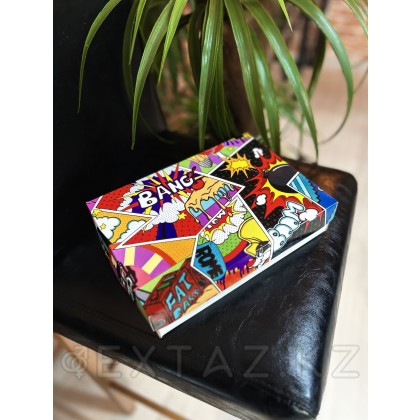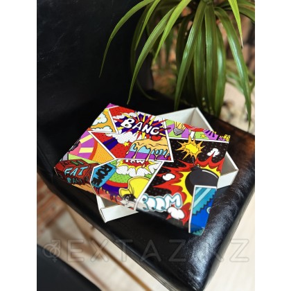 Қорап поп-арт стилінде динамикалық комикс элементтерімен, қарама-қарсы түстермен және мәнерлі жазулармен безендірілген. Бұл дизайн бірден назар аударады және мерекелік көңіл-күй, әзіл және заманауи стиль жасайды. Ішкі және төменгі жағы ақ түсті, бұл дәлдікті көрсетеді және мазмұнды көрнекі етеді.