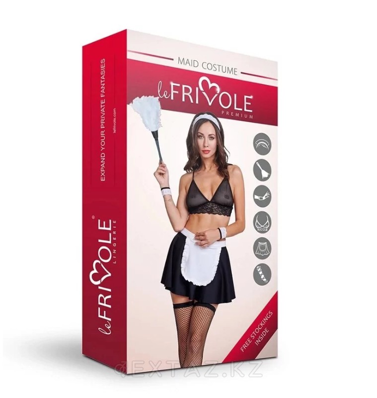 - Жиынтықта: бас киім, бюстье, манжеттер, алжапқышы бар юбка, шаң щеткасы, шұлықтар.
