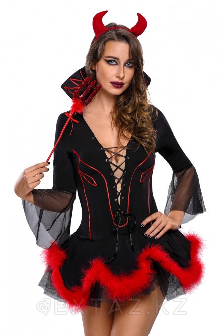 Шнурованное мини-платье с деталями пламени из блесток и аккуратным марабу подчеркивает талию, изгибы и формы. Можно расслабить шнуровку спереди, чтобы сделать свой вид более выразительным и возбуждающим и подчеркнуть дьявольский вырез. Ночь будет жаркой, когда ты наденешь этот костюм! Спрячьте под этот горячий наряд сексуальное, эротическое белье или наденьте просто соблазнительные трусики с доступом для грязных выдумок от окружающих.