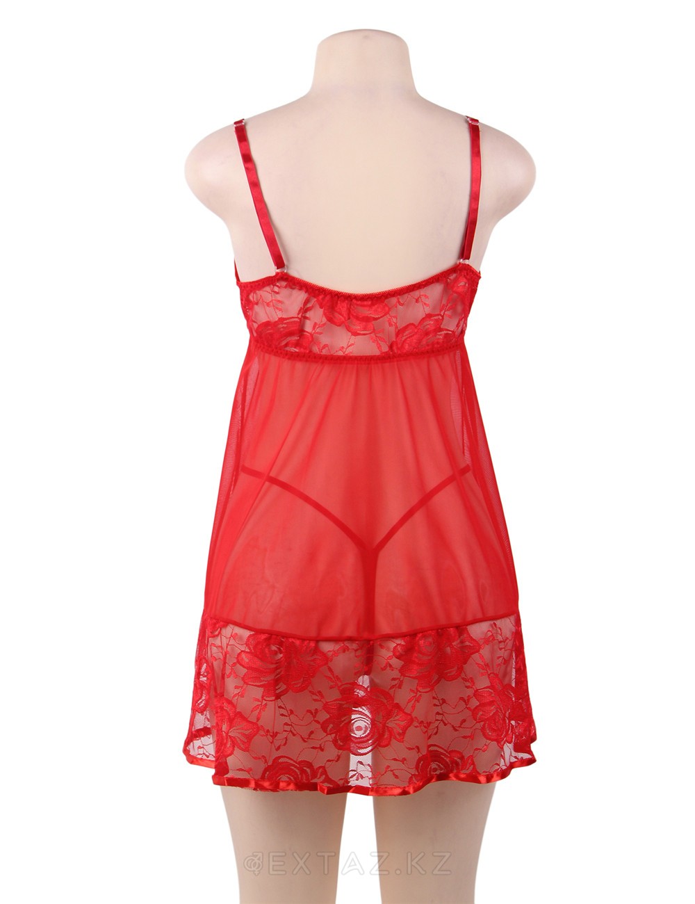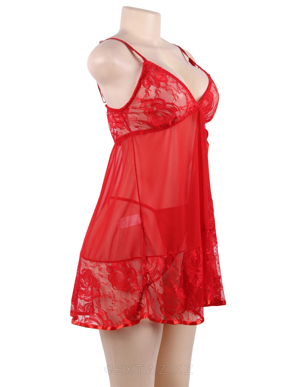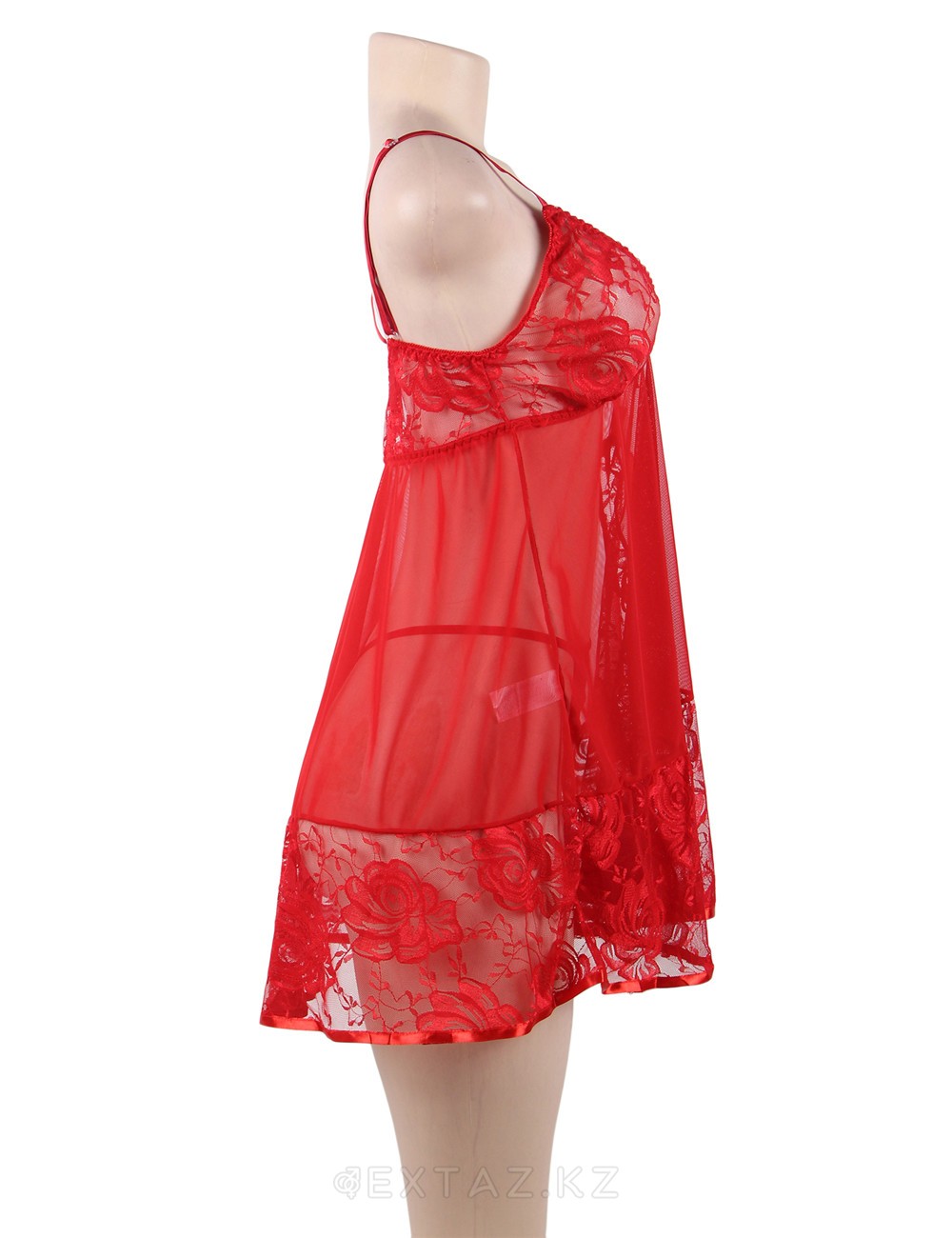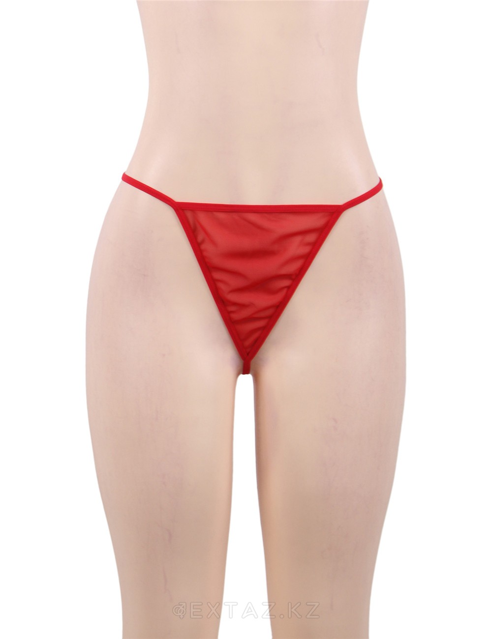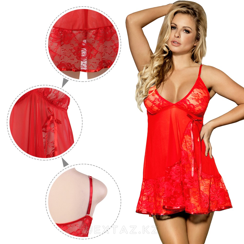 Яркий и страстный пеньюар красного цвета в комплекте с прозрачными трусиками-стрингами, выполнен из мягкого нейлонного кружева, которое приятно прилегает к телу не доставляя дискомфорта, а даря только ощущение нежной вуали. Пеньюар декорирован атласными ленточками, которые дополняют общую картинку.