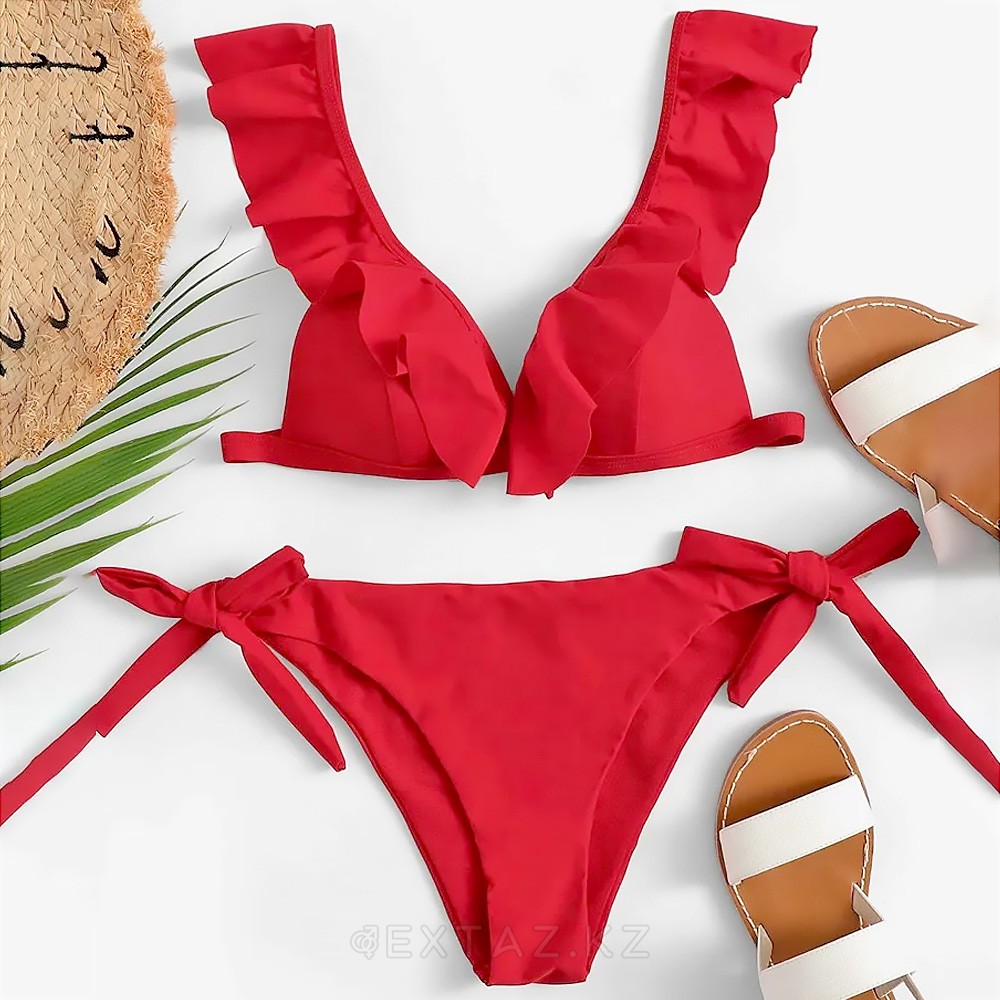 Раздельный купальник красивого цвета красного вина. Лямки украшены волнообразными рюшками. Топ и трусики на завязках. Идеальный купальник для летнего отдыха на пляже! Очень женственный и привлекательный купальный костюм, который украсит ваш отдых! Чтобы отдых действительно удался, в дополнение к купальнику можно подобрать аквашузы у нас в интернет магазине.