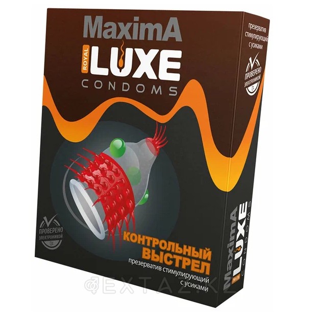 Luxe Maxima Контрольный выстрел — это презерватив для тех, кто любит не просто страсть, а настоящие ощущения на грани возможностей. Его необычный рельеф создан для максимальной стимуляции партнёрши: на поверхности расположены ряды усиков разной длины и толщины, а также шарики, которые дарят неповторимые тактильные ощущения при каждом движении.