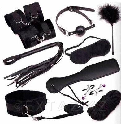 Жинаққа кіреді маска, наручники, манжеты для ног, кнут, зажимы для сосков, воротник, веревка, шлепалки