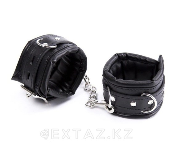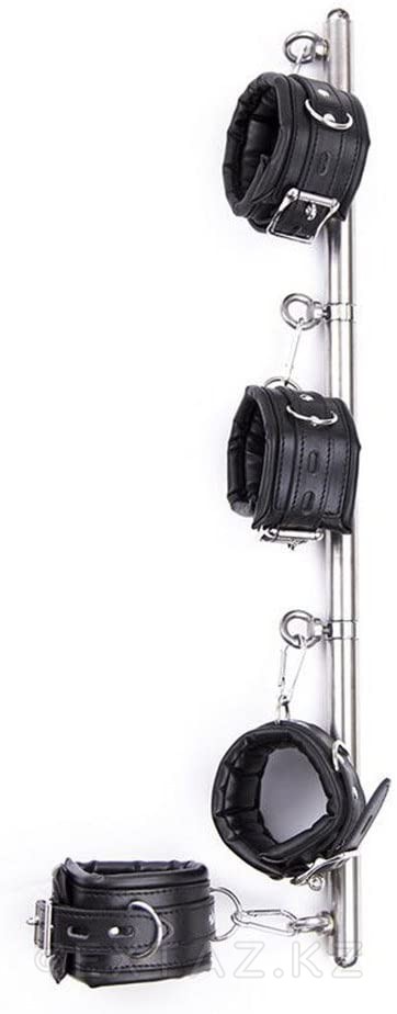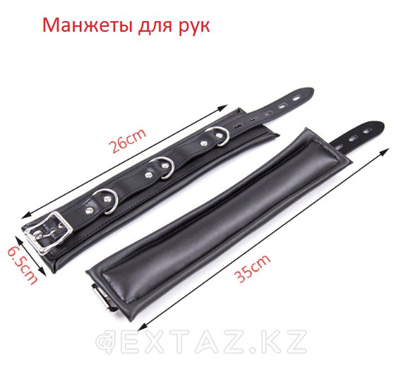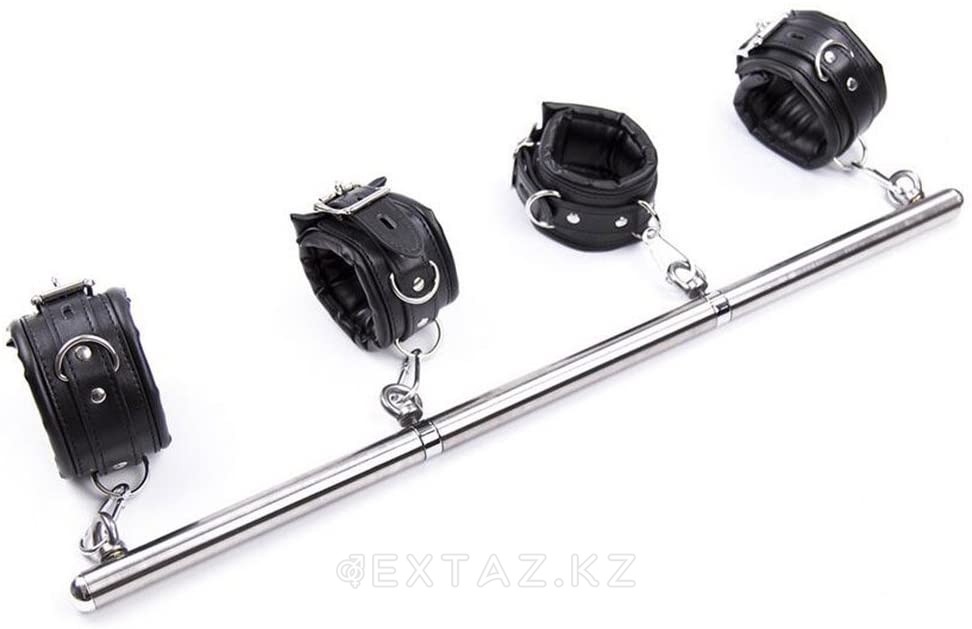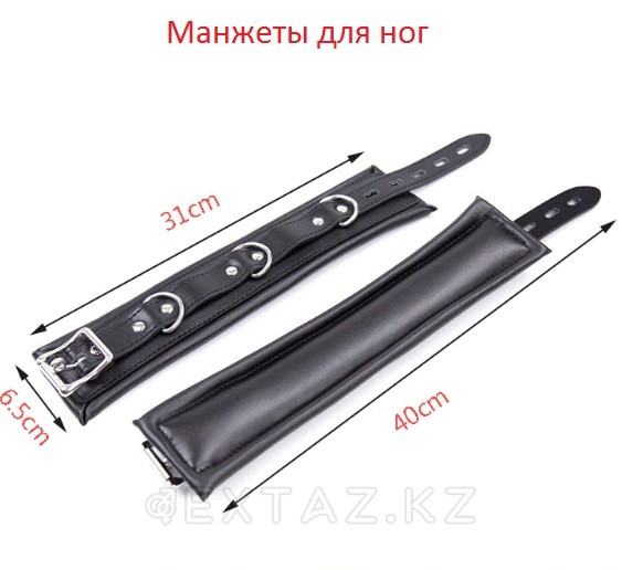 Набор для самого жесткого соития! Руки и ноги  скреплены в одном положении и обездвижены и  партнер полностью в вашей власти! !Одна пара манжет для рук и вторая для ног. Выполнены из мягкой искусственной кожи. Украшены кольцами и клепками. Размер регулируется с помощью классической застёжки. Можно применять набор в разных позах. Но, испытав однажды данный набор, он навсегда войдет в вашу интимную жизнь! Наручники очень мягкие, комфортно для длительного использования. Металлическая основа сделана из нержавеющей стали. Крепеж очень прочный, выполнен из качественных материалов.