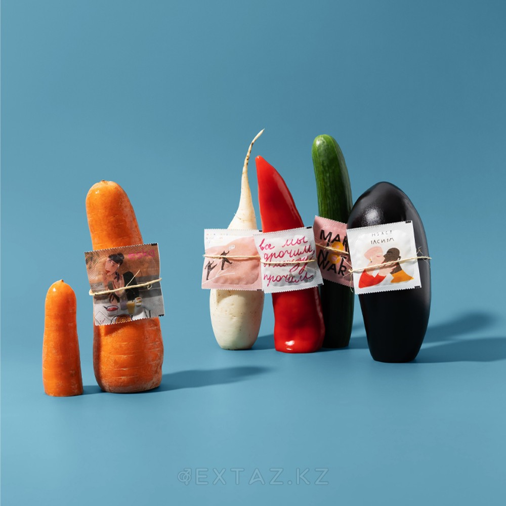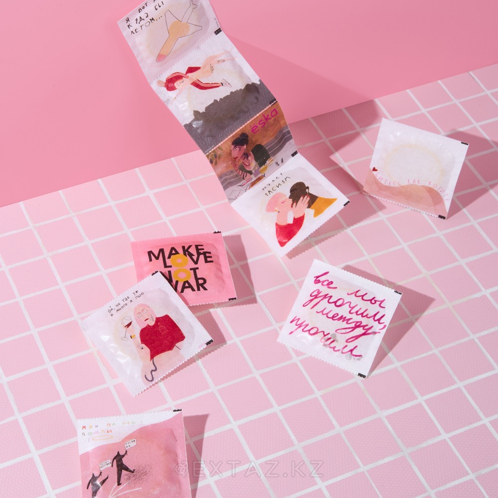 * Эстетикалық дизайн-жиынтықта 9 презерватив, әрқайсысы ерекше жарқын пакетте.