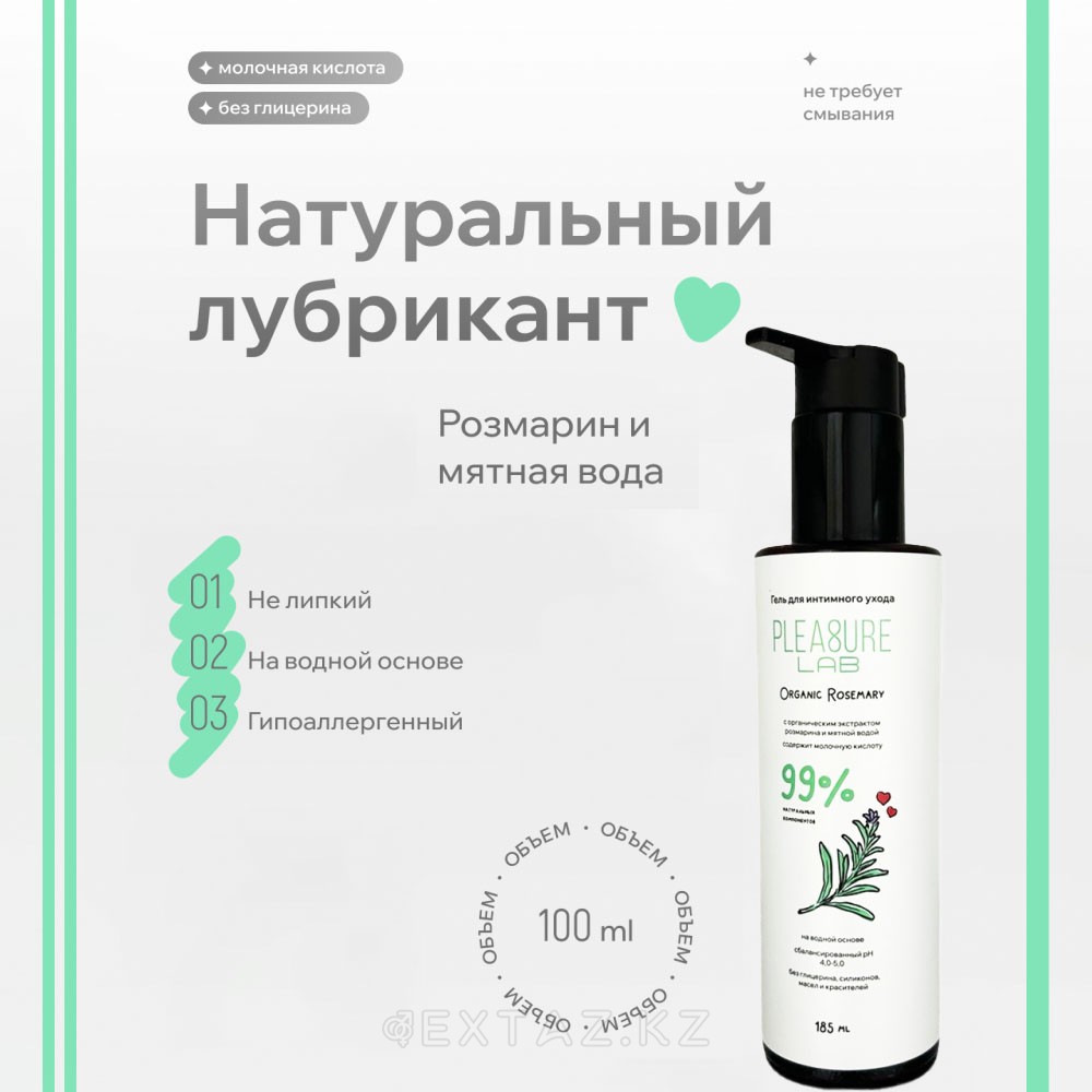 Су негізіндегі Pleasure Lab Plganic Rosemary жағармайы теріге ыңғайлы сырғанау мен нәзік әсер береді. Өсімдік компоненттері бар Формула сезімтал теріге жарамды және пайдалану кезінде жайлылық сезімін сақтайды.