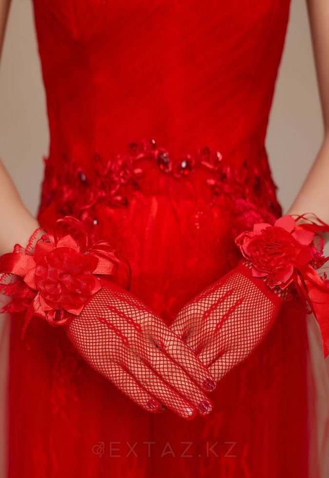 Элегантные красные перчатки в мелкую сеточку, декорированные цветами и лентами, с закрытыми пальчиками - для тех, кто предпочитает безупречную классику и любит яркие аксессуары.
