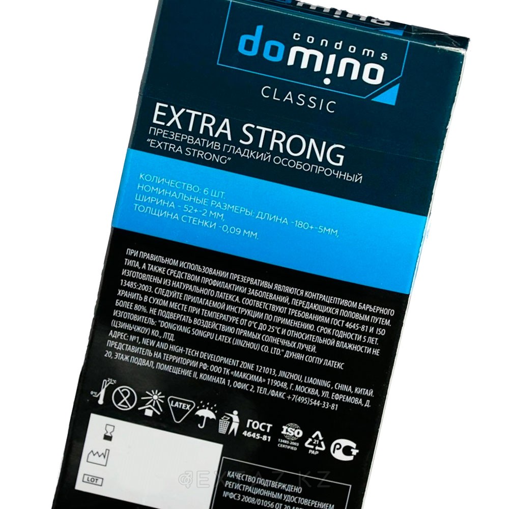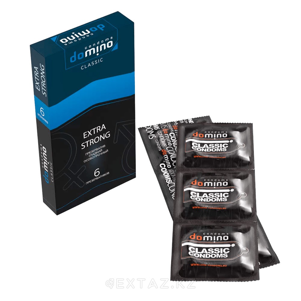 Domino Classic Extra Strong ерекше берік презервативтері сенімділік пен қауіпсіздікті бірінші орынға қоятындар үшін арнайы жасалған. Жоғары сапалы табиғи латекстен жасалған қабырға қалыңдығының жоғарылауымен олар анальды жыныстық қатынас пен басқа да қарқынды жанасу үшін өте қолайлы. Қосымша майлау кез-келген жағдайға сенімді болуға мүмкіндік беретін жайлылық пен қорғауды қамтамасыз етеді.