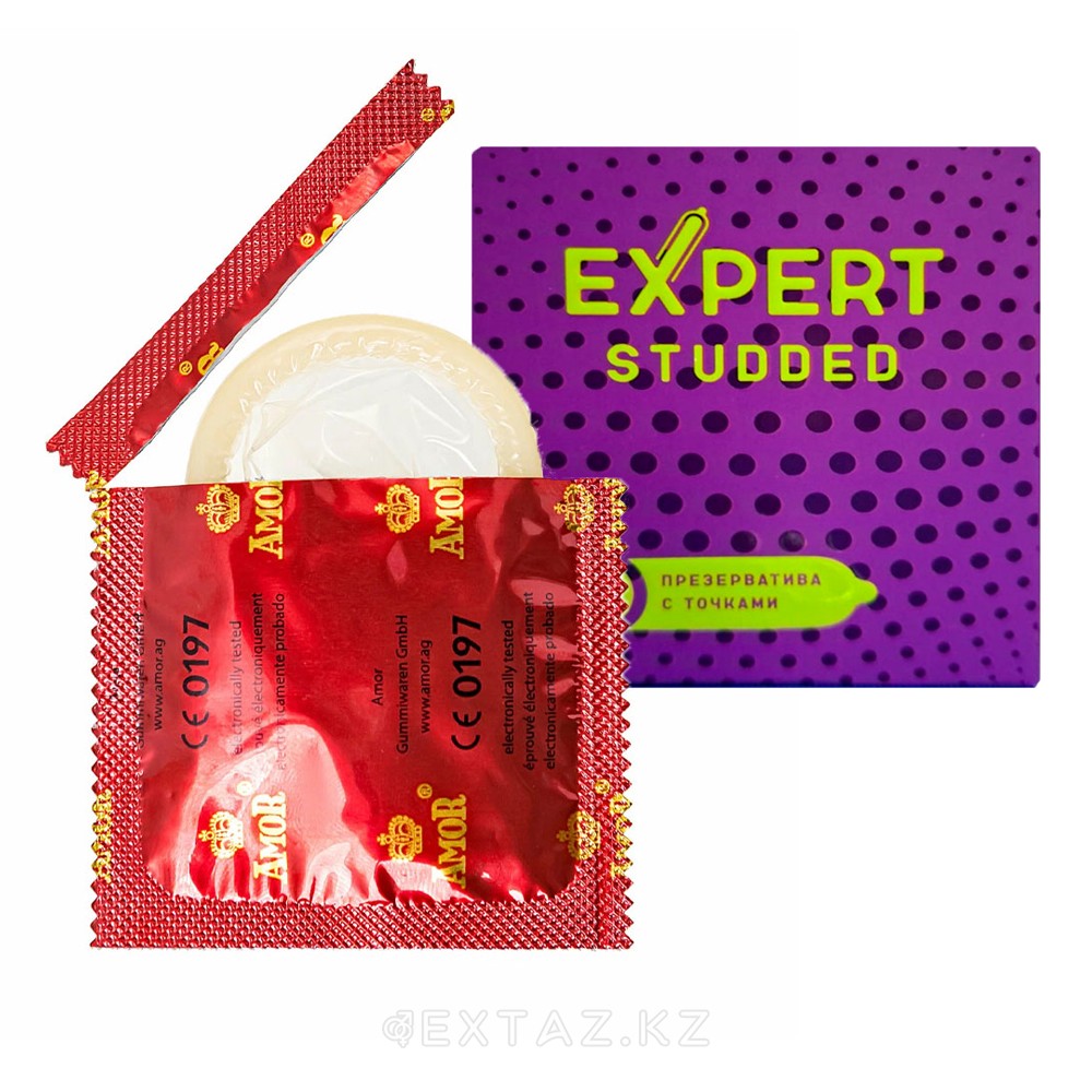 Диск жетегі бар Expert Studded презервативтері табиғи латекстен жасалған және орташа қосымша ынталандыру үшін нүктелік бет құрылымымен жабдықталған. Қабырғаның анатомиялық пішіні мен қалыңдығы 0,06 мм болғандықтан, олар әр жағдайда жайлылық пен сенімді қорғауды қамтамасыз етеді.