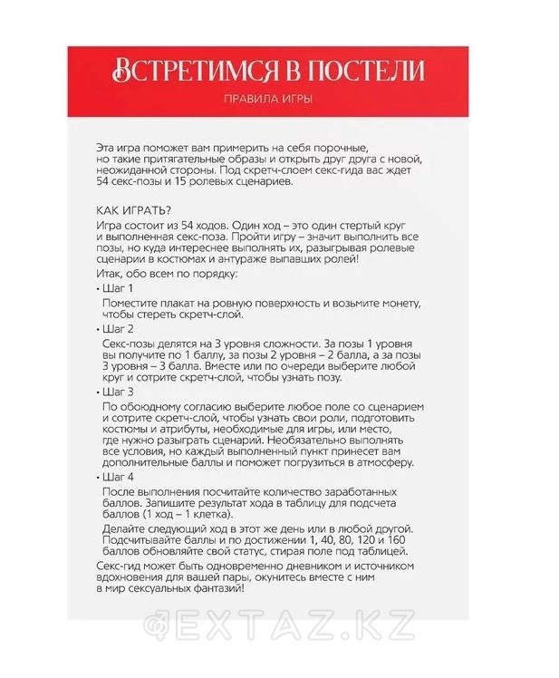 Скретч қабатының астында сізді 54 поза және 15 рөлдік сценарий күтеді. Мұның бәрі бір-бірінен ерікті ләззат алу әлеміне енудің жарқын бастамасы болады. Ішінде сіз A3 плакаты мен ойын ережелерін таба аласыз.