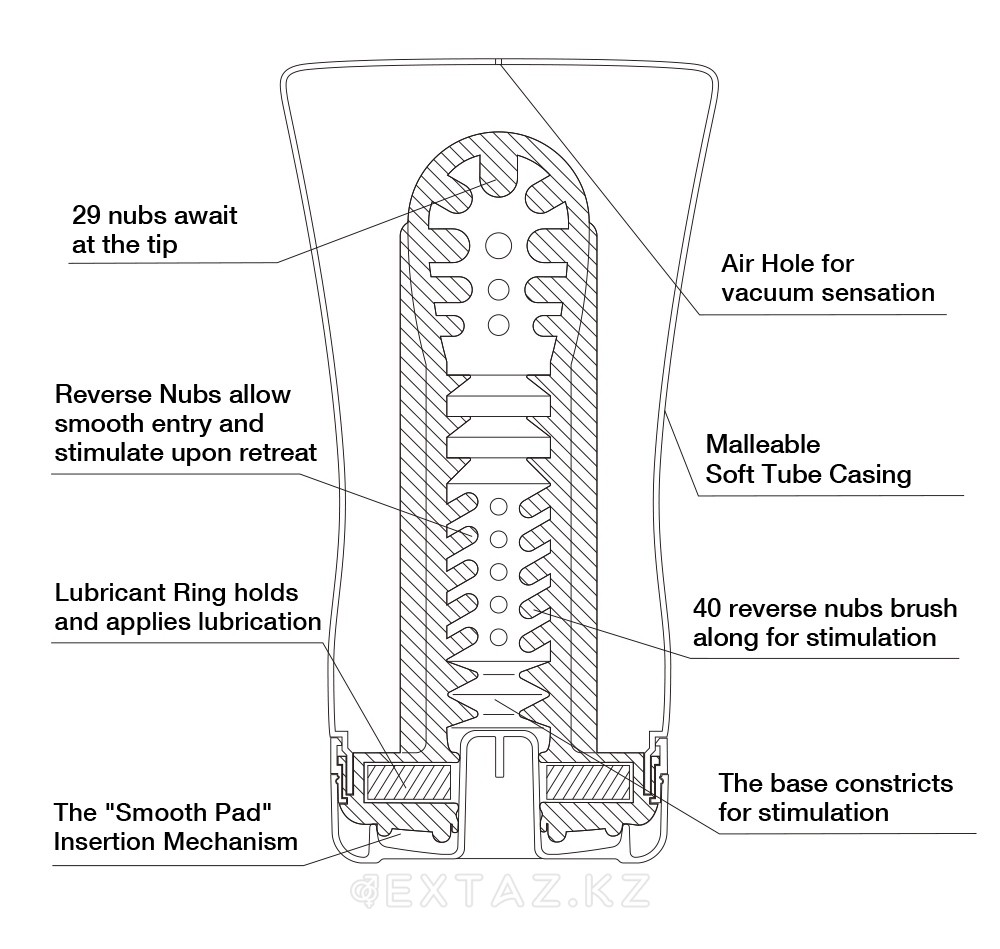 Игрушка выполнена из невероятно нежного на ощупь материала, не имеющего запаха и не содержащего вредных для организма веществ. Отверстие достаточно узкое и очень эластичное – она запросто растянется до нужного размера под вашим напором. Внутренний канал покрыт многочисленными выпуклостями, целых семьдесят нежных и шаловливых усиков, расположенных внутри мастурбатора, примерно сорок усиков будут услаждать основание пениса, а тридцать займутся стимуляцией головки.
