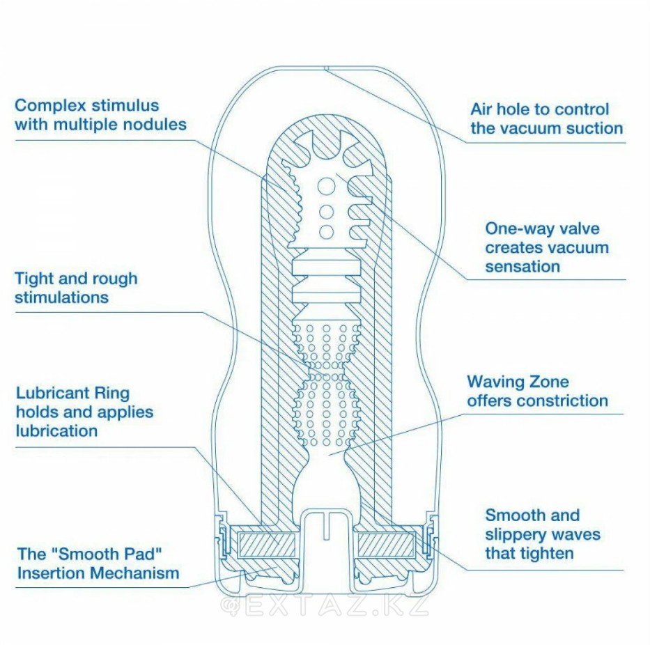Ең жаңа технологиялармен жасалған, көптеген үлкен және кішкентай шығыңқы жерлер, қабырғалар және бастың айналмалы ынталандыру аймағы бар ішкі рельеф сапалы қанағаттануды қамтамасыз етеді және керемет шарықтау шегіне әкеледі. Ойыншық пенистің оңай батып кетуіне ықпал етеді, ұзындығы мен ені бойынша созылып, терең минетке еліктейді. Салқындату әсері бар. Қозғалыстардың қарқындылығы мен тереңдігін реттеңіз және ақылға қонымды Ләззаттың тұңғиығына еніңіз!