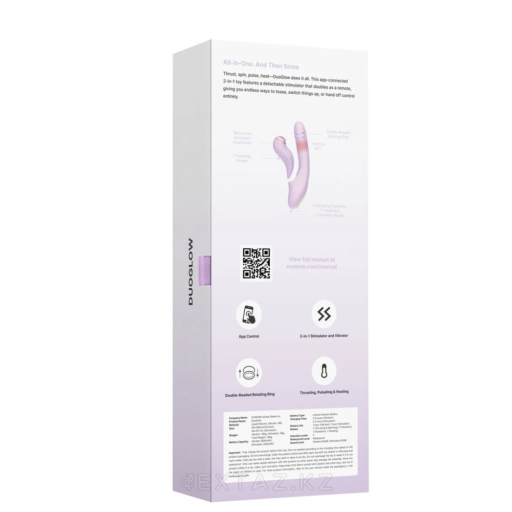 SVAKOM DuoGlow-мобильді қосымша арқылы синхрондау мүмкіндігі бар негізгі вибратор мен алынбалы клиторальды пульсаторды біріктіретін 2-ден 1-ге дейінгі модульдік діріл массажы. Құрылғы режимдерді дәл баптауға және модульдердің тәуелсіз жұмысына баса назар аудара отырып, басқарылатын және мүмкіндіктерге бай пайдалануға арналған.