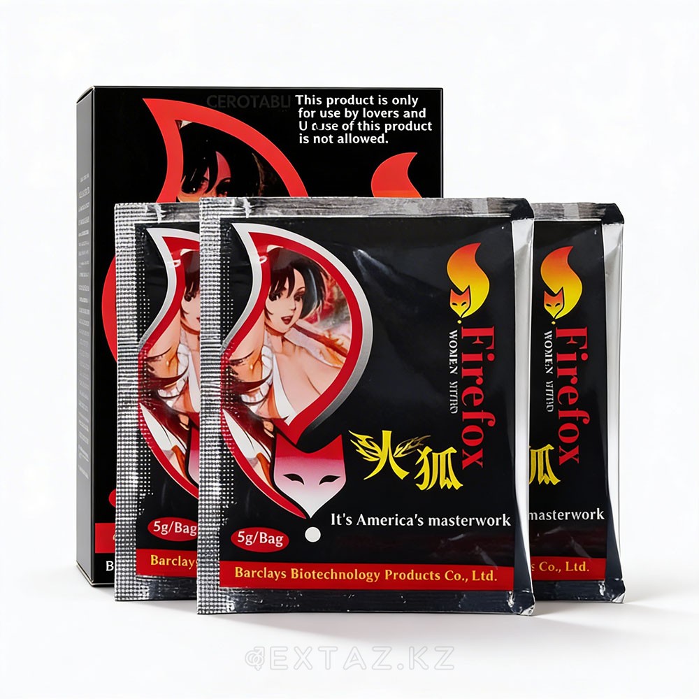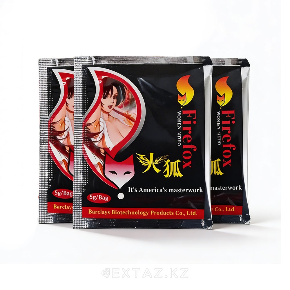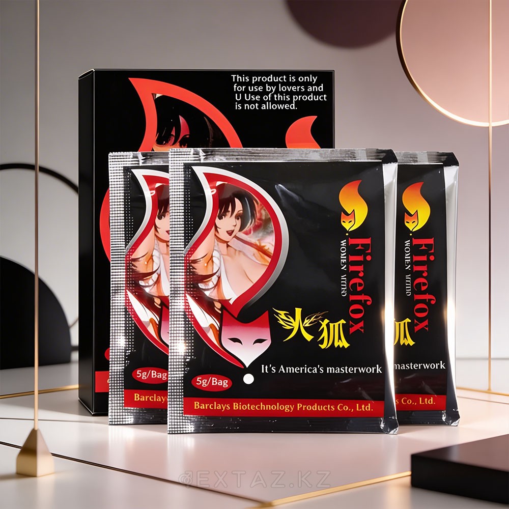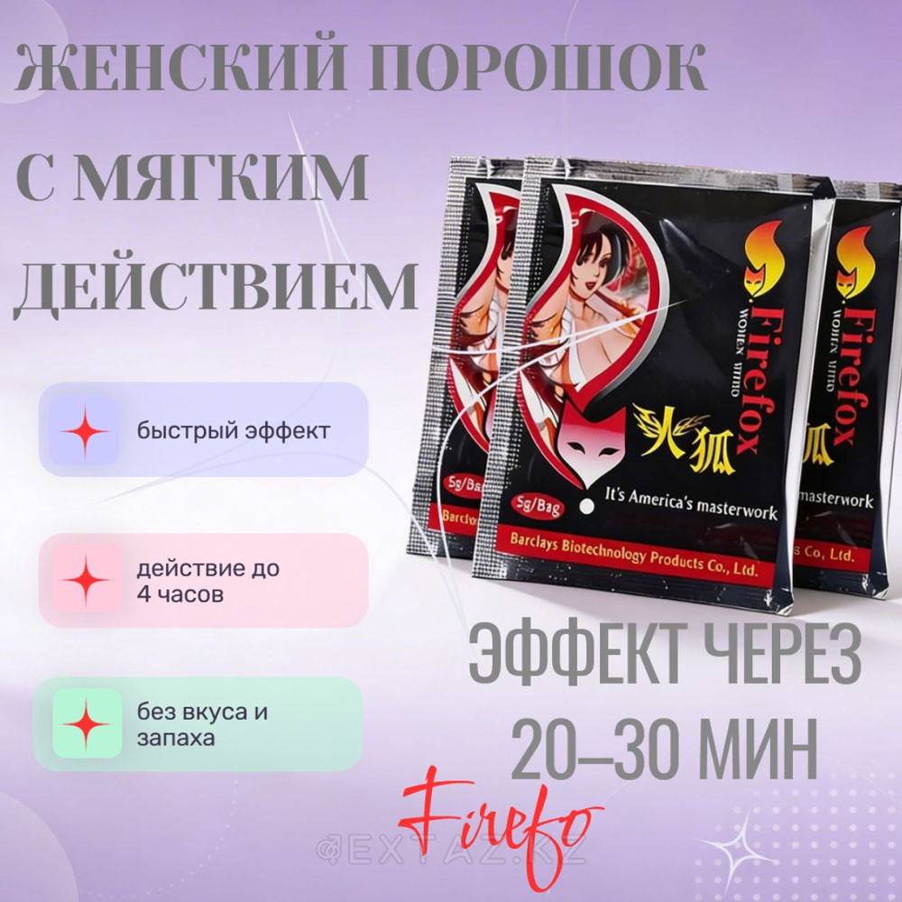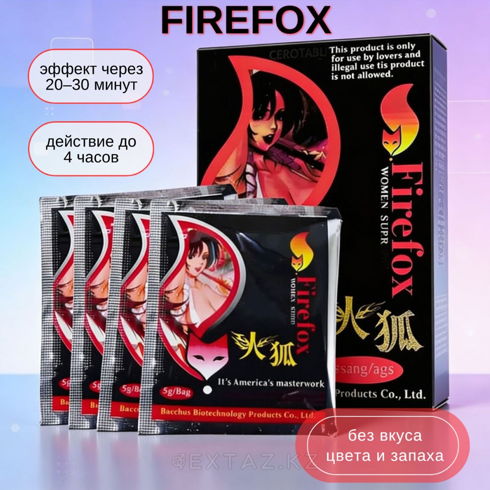 "Firefox" - табиғи компоненттер негізінде жасалған ұнтақ форматындағы тиімді әйел қоздырғышы. Ол жыныстық тартымдылықты ақырын оятады және қызығушылықты арттырады, бұл әйелді босаңсытып, жақындыққа ашық етеді.