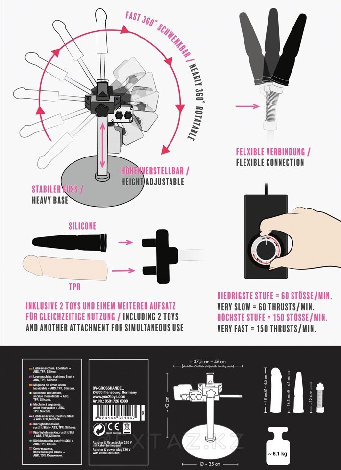 Этот красавец оснащен мощнейшим бесшумным мотором, который обеспечит вам до 150 фрикций в минуту. Идеально подходит как для вагинального, так и для анального проникновения. Для интимного разнообразия машина поставляется с двумя насадками. Для вашего удовольствия производитель предоставляет реалистик телесного цвета и черный анальный фаллоимитатор.