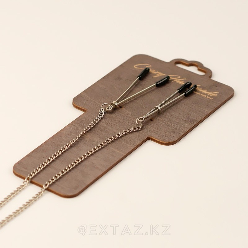 Бұл емізік қысқыштары теріге зақым келтірместен қауіпсіз және ыңғайлы пайдалануды қамтамасыз ететін резеңке ұштарының арқасында емізіктерді ақырын қысады. Қысқыштар аксессуарға қосымша экспрессивтілік пен стиль беретін металл тізбекпен біріктірілген. Қысқыштардың қысу күші тістердегі жылжымалы сақинамен реттеледі, бұл әсердің қарқындылығын қалауыңызға қарай реттеуге мүмкіндік береді.
